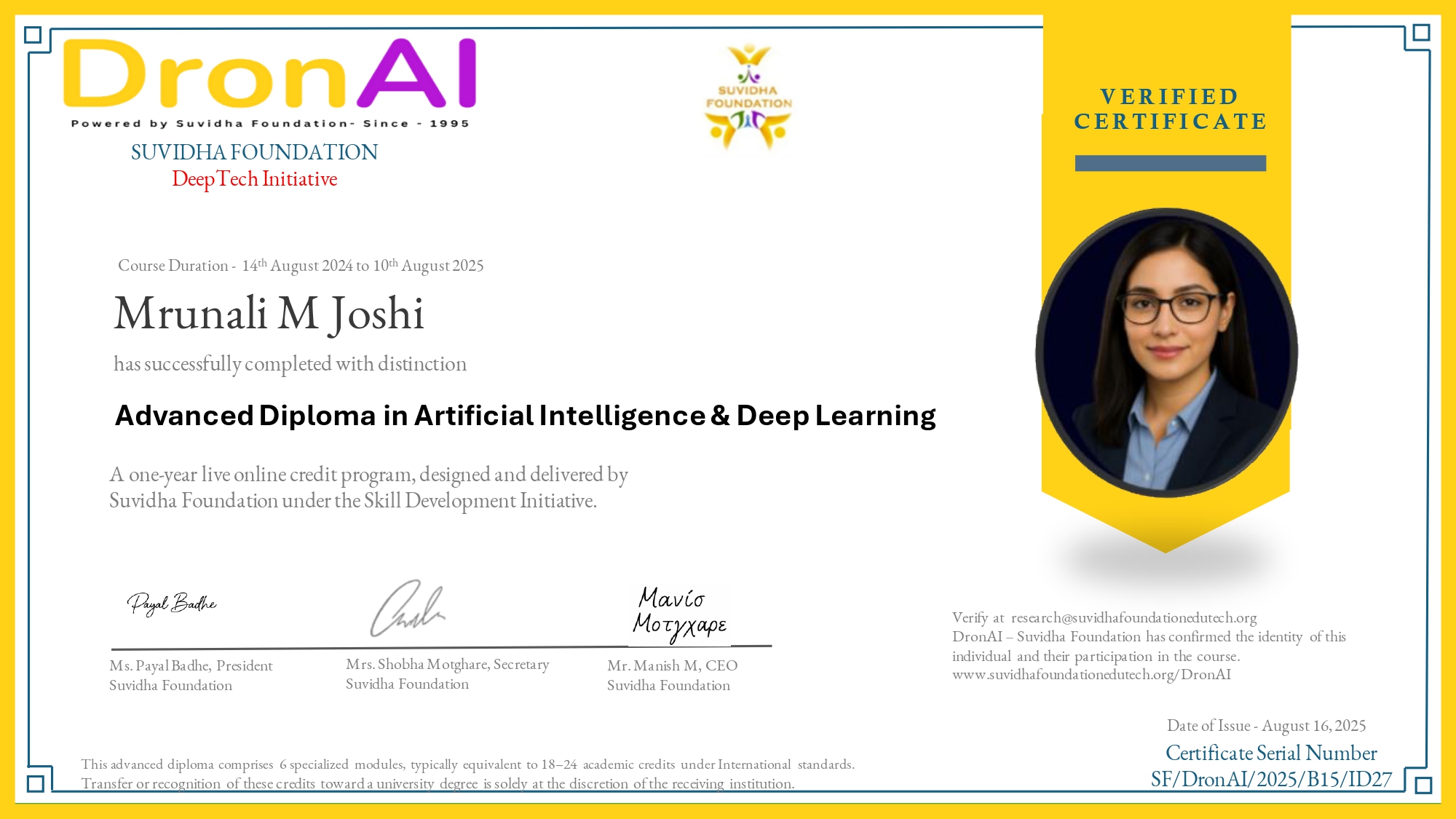 Suvidha Foundation's DronAI program offers a free, world-class, 1-year AI & Deep Learning Certification designed to boost your employability and career growth.